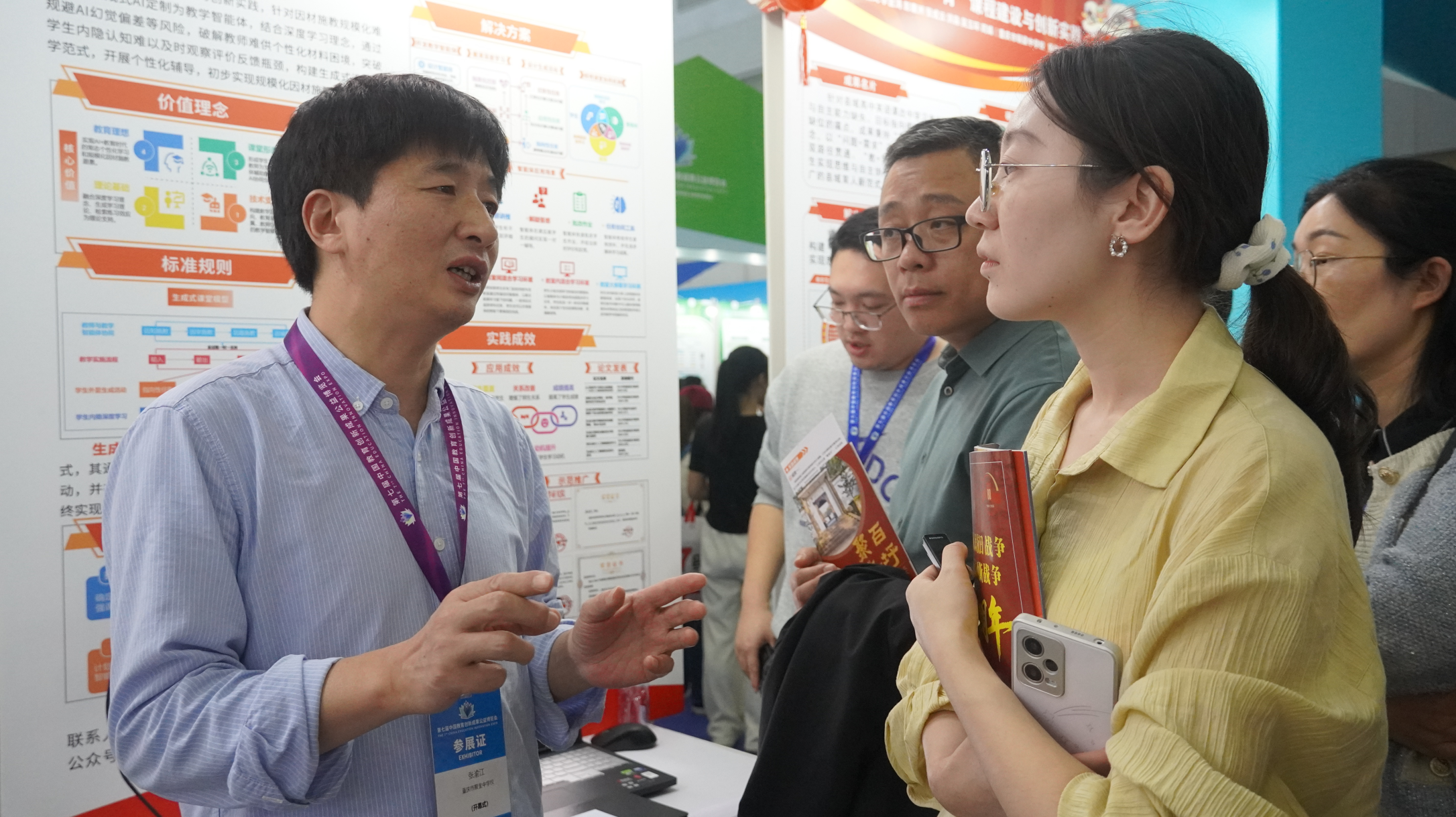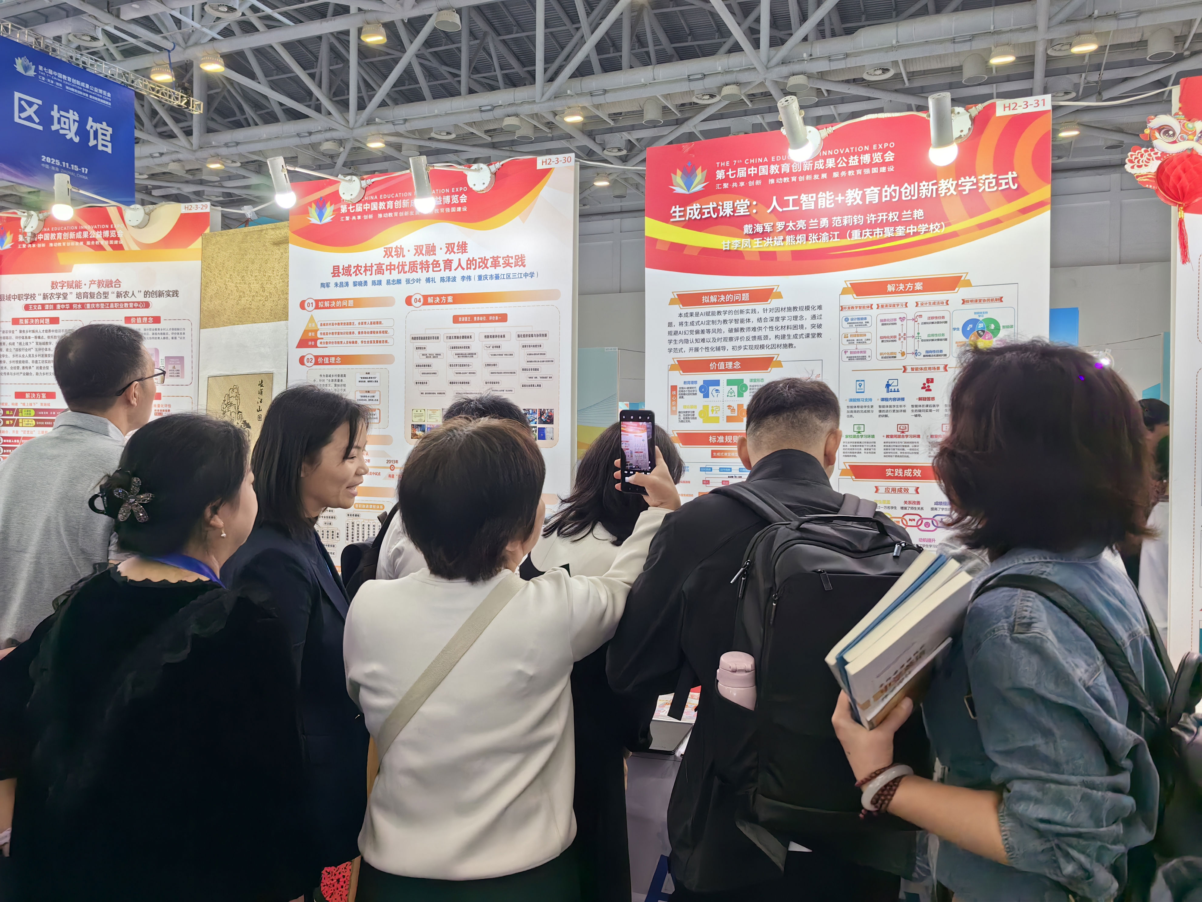 展会现场,聚奎中学生成式课堂展位前人头攒动,成为瞩目的焦点。来自全国各地的教育同仁围绕AI助学单设计、多模态资源整合等创新点频频提问、驻足交流。