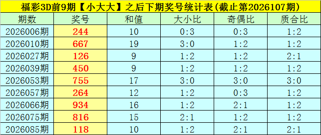 一、上期回顾:福彩3D第2026107期奖号为:278,奖号类型开出组六,大小比为2:1,奇偶比为1:2,和值为17,跨度为6,012路比为0:1:2。